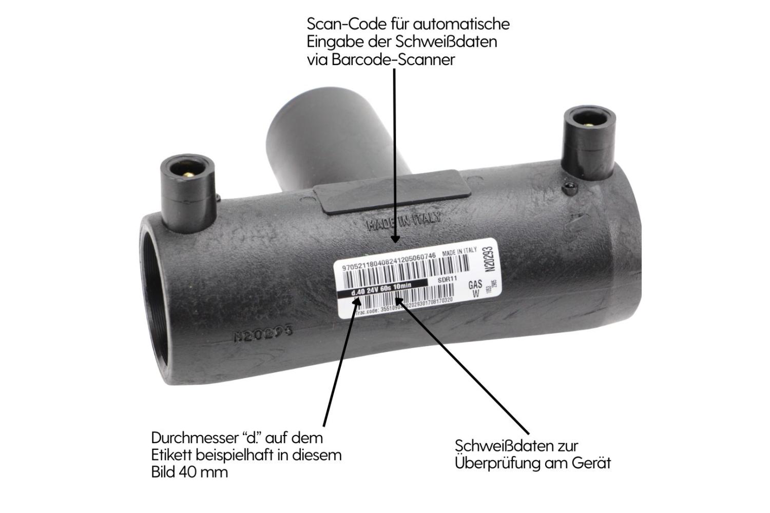 Alle Formstücke sind gekennzeichnet durch Aufdruck, Prägung oder Etikett, damit dauerhaft lesbar. Die Formstücke, die für die Schweißverbindungen verwendet werden, weisen einen Strichcode nach der Norm ISO 13950 zum Erkennen der Schweißparameter und den