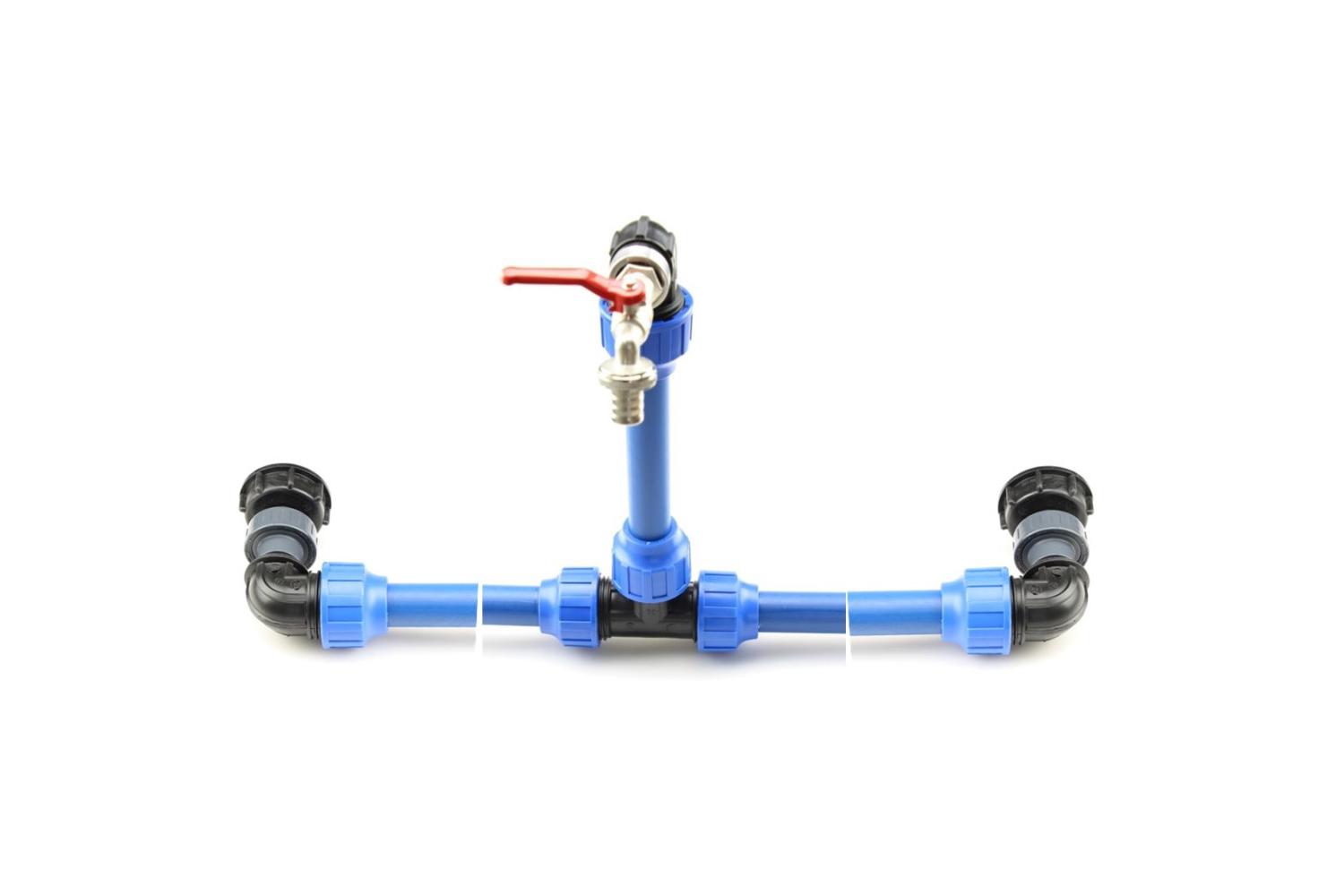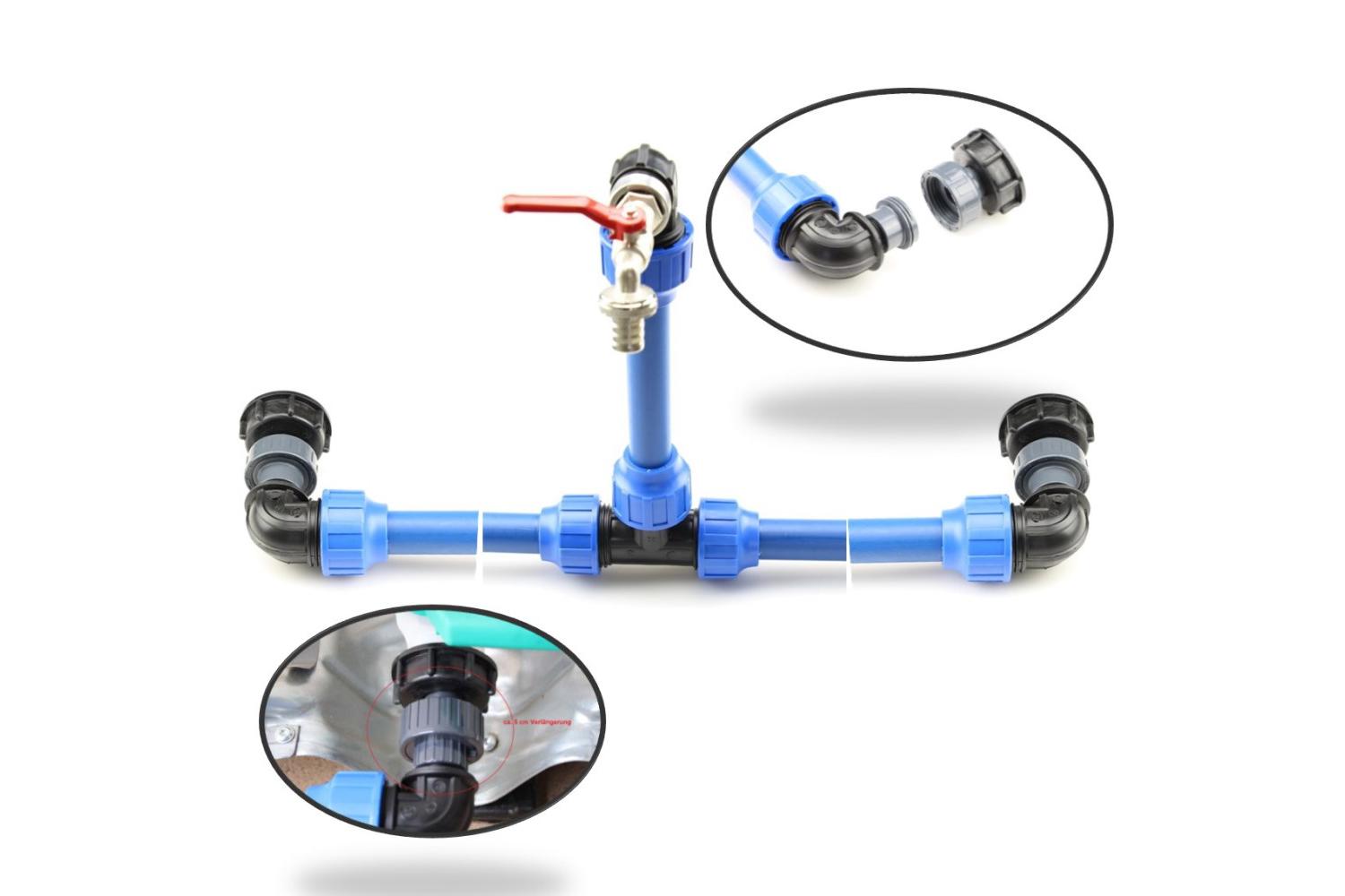 VERBINDUNG VON 2 TANKS EINFACHE STABILE IBC TANK VERBINDUNG MIT SCHWANENHALSAUSLAUF mit stabiler PE 32 mm Leitung und einem 3/4 Zoll Auslaufhahn